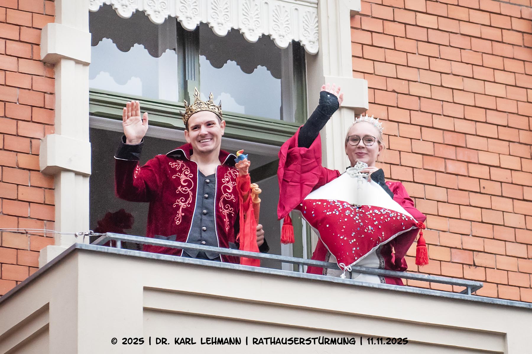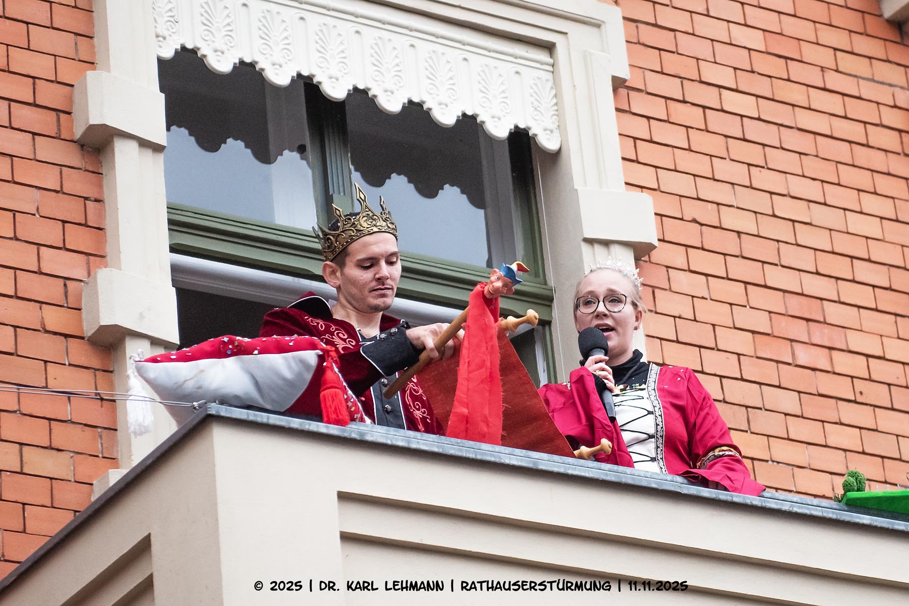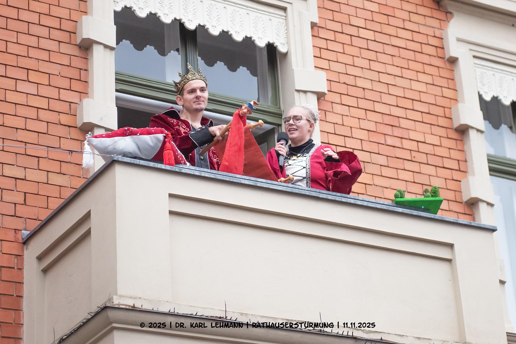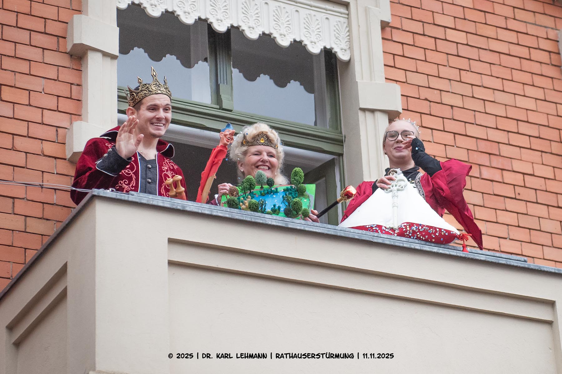 Nach der Schlüsselübergabe ging es hoch hinaus: Vom Rathausbalkon sprach das Prinzenpaar zum närrischen Volk und überreichte der Bürgermeisterin ein Modell, das den Wunsch nach einem wiederbegehbaren Rundweg um den Löhmer Haussee symbolisierte – ein karnevalistischer Appell mit lokalem Herz.