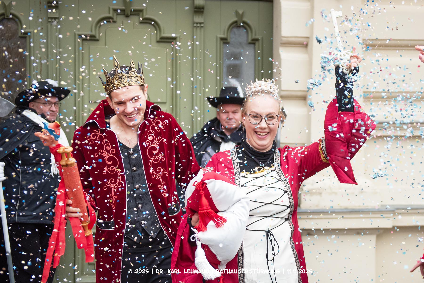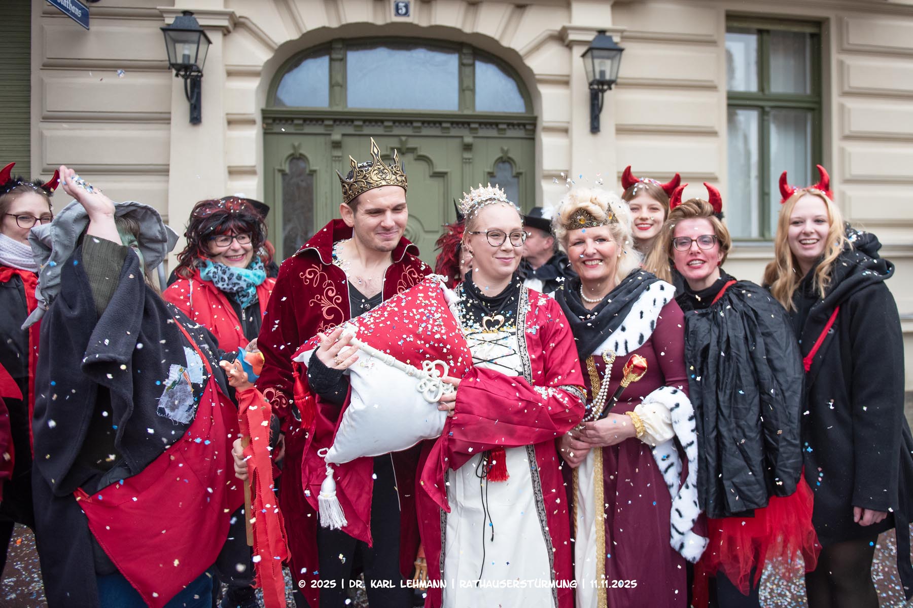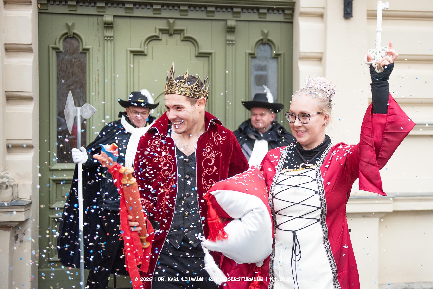 Begleitet von der Wache und der bunt gekleideten Gefolgschaft forderten sie mit karnevalistischer Entschlossenheit die Herausgabe des Stadtschlüssels.